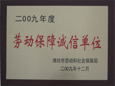 2009年12月,我公司獲濰坊市勞動(dòng)和社會(huì)保障局評(píng)定的勞動(dòng)保障誠(chéng)信單位的榮譽(yù)。