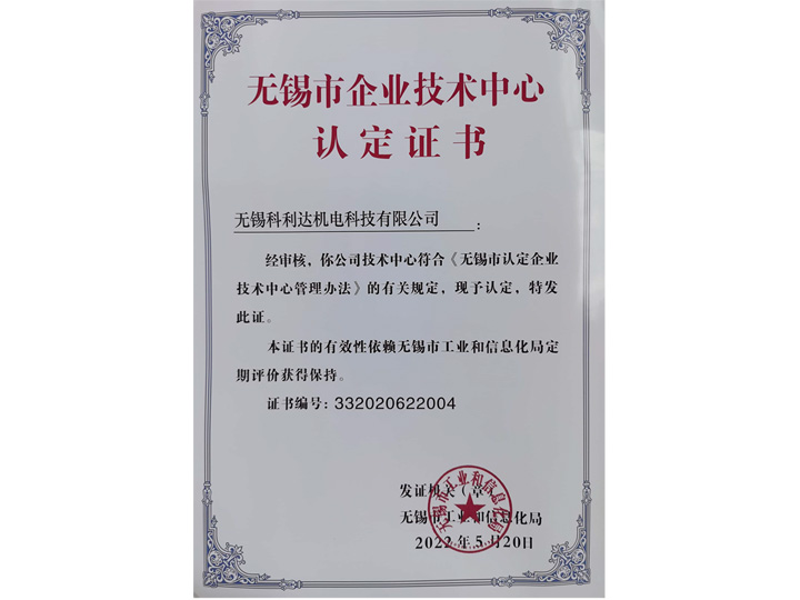 無錫市企業(yè)技術(shù)中心認定證書