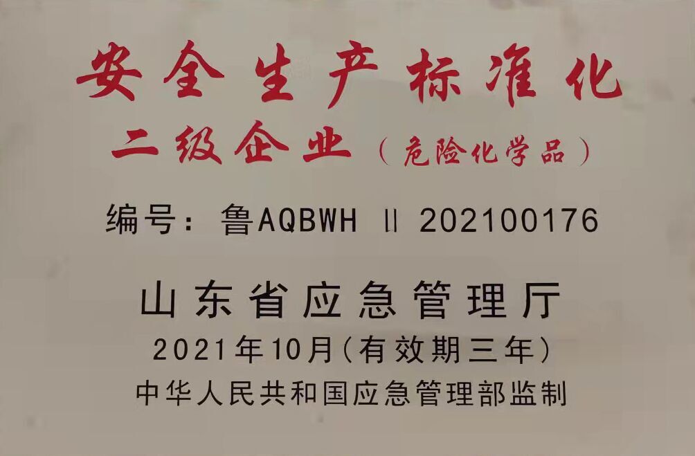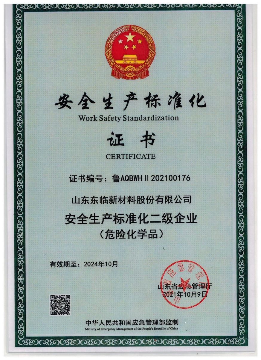 近日,山東東臨新材料股份有限公司獲得了由國(guó)家應(yīng)急管理部監(jiān)制、山東省應(yīng)急管理廳頒發(fā)的“安全生產(chǎn)標(biāo)準(zhǔn)化二級(jí)企業(yè)”證書(shū)。